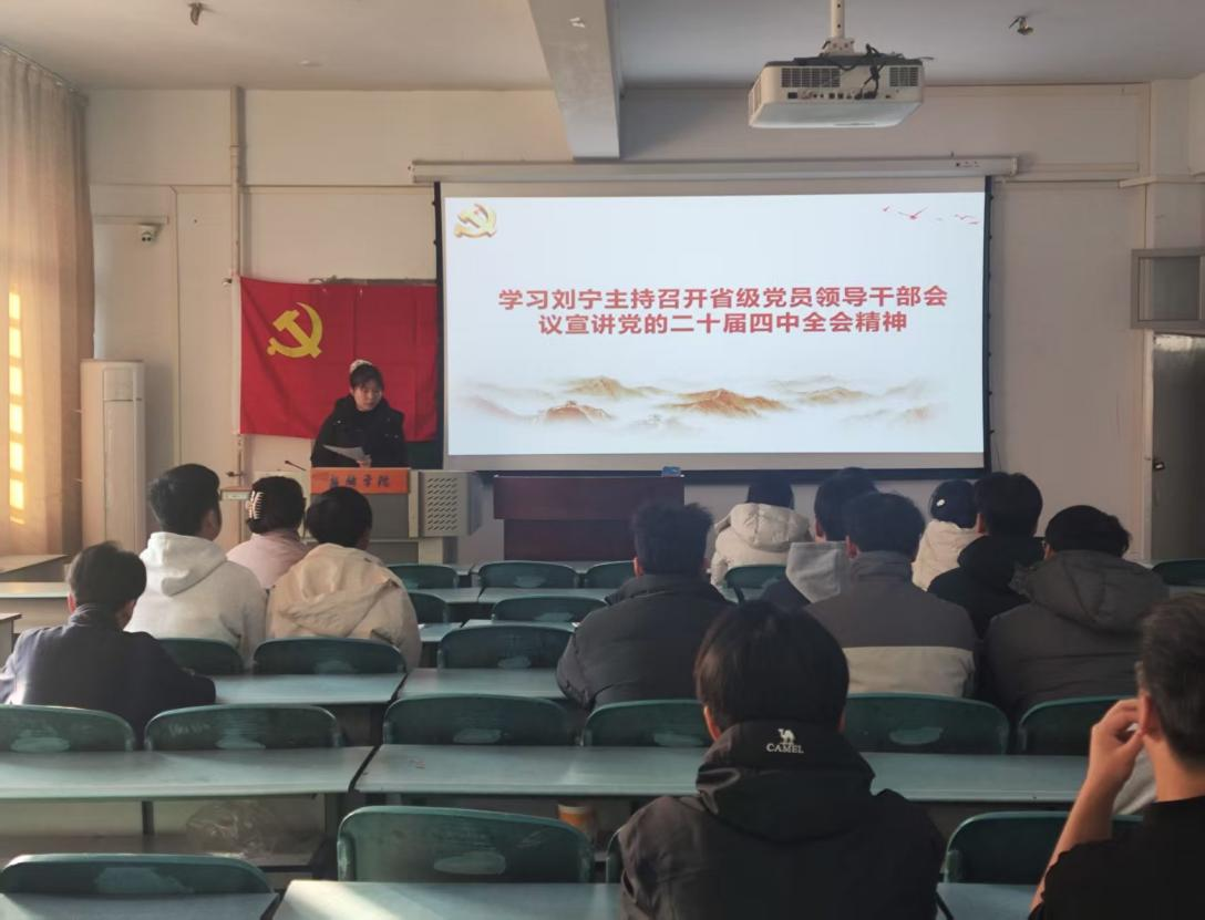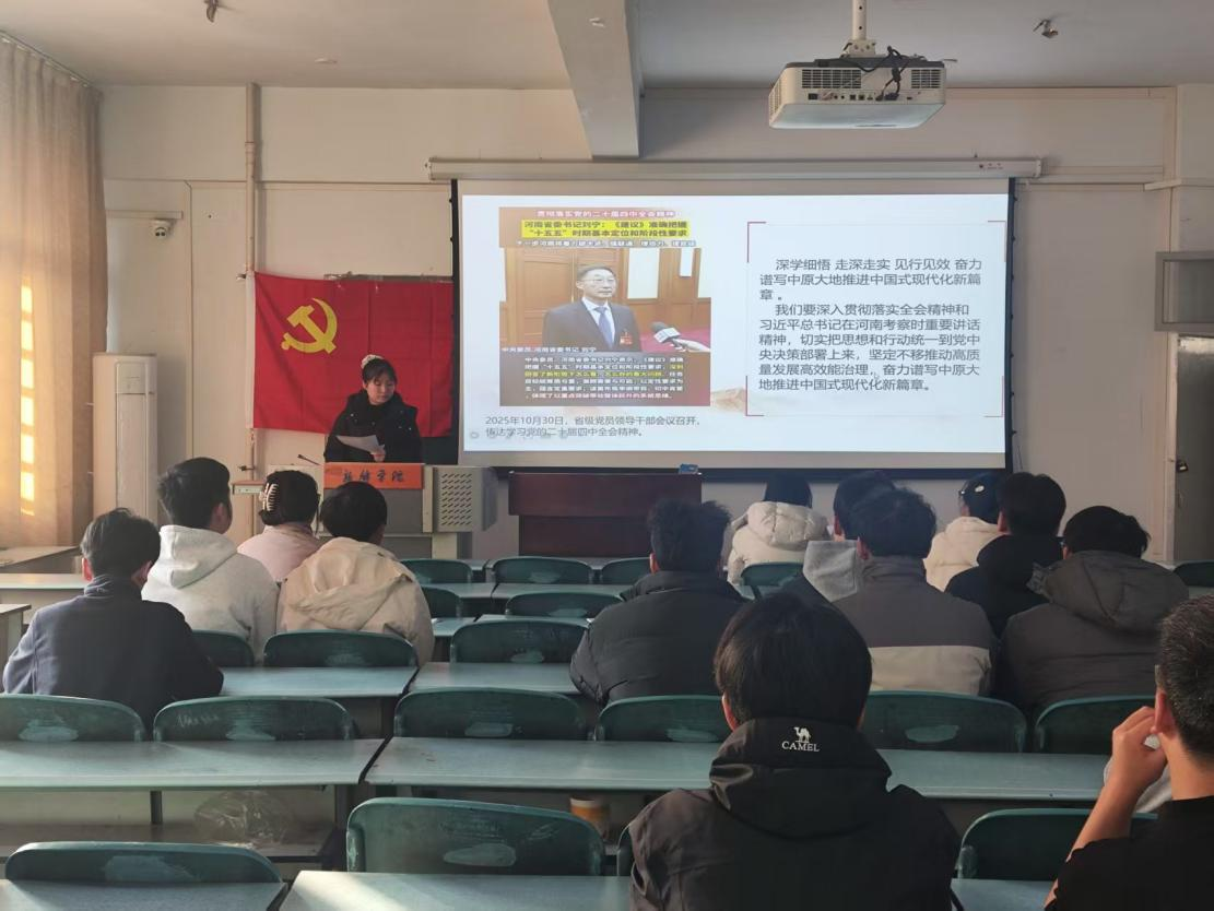为深入学习宣传贯彻党的二十届四中全会精神,把青年党员的思想和行动统一到全会决策部署上来,2025年12月16日,WilliamHill威廉希尔学生第四党支部全体党员、入党积极分子开展专题党课学习。本次党课聚焦刘宁主持召开的省级党员领导干部会议宣讲党的二十届四中全会精神核心内容,结合中原大地推进中国式现代化的实践要求,为支部成员筑牢思想根基、明晰行动方向。