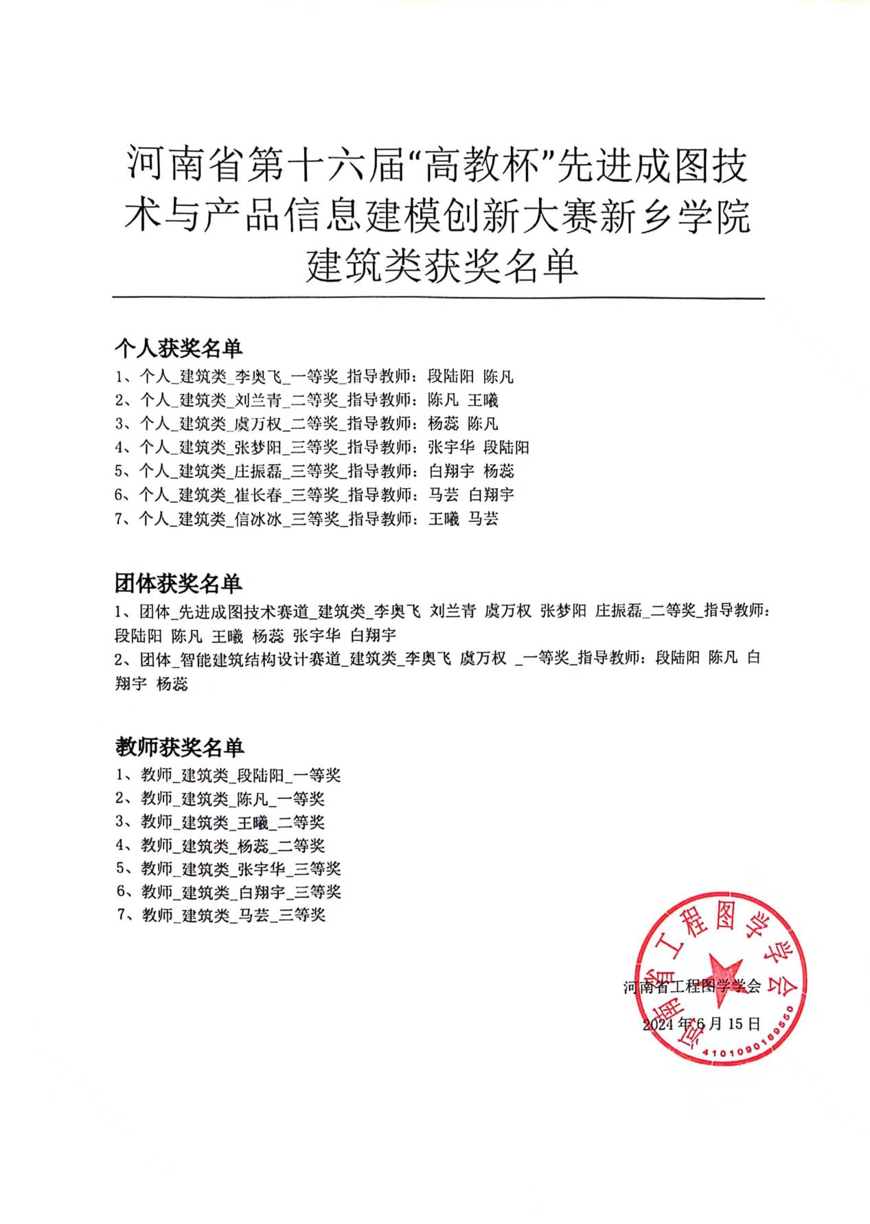 本次比赛共有来自全省各高校的近千名学生参与,涵盖了建筑类、水利类、道桥类多个专业领域。WilliamHill威廉希尔参赛团队凭借其精湛的专业技能和创新思维,脱颖而出,取得了优异的成绩。在建筑类赛道中,WilliamHill威廉希尔的学生李奥飞、虞万权等荣获团队一等奖,李奥飞荣获建筑类赛道个人一等奖,刘兰青、虞万权荣获建筑类赛道个人二等奖,段陆阳和陈凡荣获建筑类指导教师一等奖。