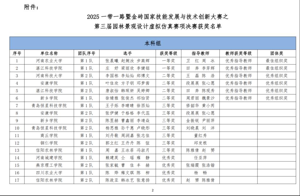 2025年12月20日,一带一路暨金砖国家技能发展与技术创新大赛第三届园林景观设计虚拟仿真赛项决赛在线上圆满落幕。土建学院风景园林专业学生表现优异,共荣获国家级二等奖、三等奖各一项,同时获评“团体优秀组织奖”。
