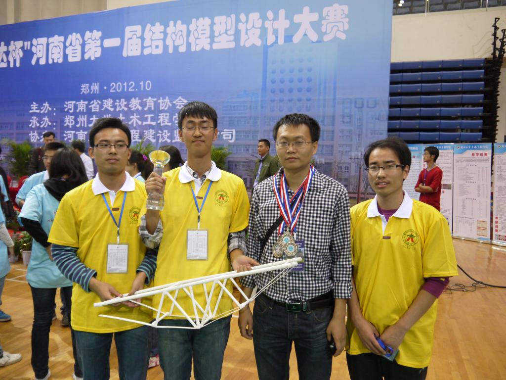由河南省建设教育协会主办,郑州大学承办的“建达杯”河南省第一届结构模型设计大赛于10月12日至14日在郑州大学中心体育馆举行,来自郑州大学、河南大学、华北水利水电学院及我校等15所高校的27个队伍参加了比赛。我系派出的由10土木工程专业学生文昊天,王忠凯,李丹枫组成的代表队,在夏锦红主任的带领下,经过软件计算、现场模型制作、自我陈述、现场加载等环节的比赛角逐,最终在众多高校优秀作品中脱颖而出,荣获大赛二等奖。