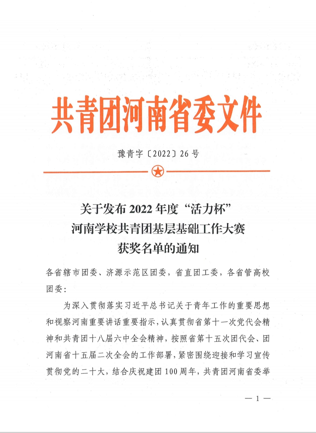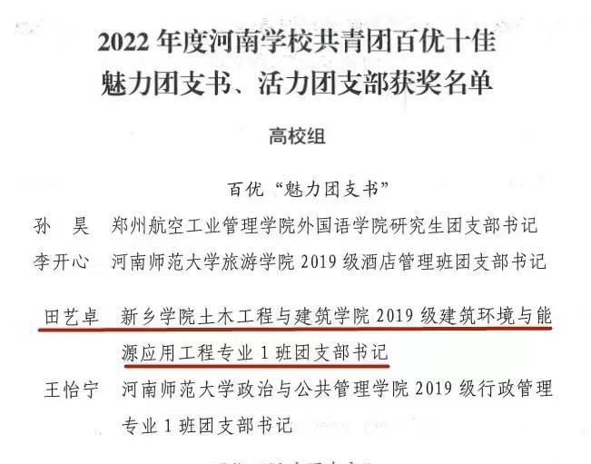 近日,共青团河南省委下发了《关于发布2022年度“活力杯”河南学校共青团基层基础工作大赛获奖名单的通知》,我院团委书记许玲玲老师的微团课《点水成冰绽放青春活力》斩获“一等奖”,2019级建筑环境与能源应用工程1班团支部书记田艺卓同学荣获百优“魅力团支书”称号。
