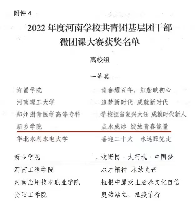 本次大赛由共青团河南省委主办,全省共有1074个共青团工作项目、442节微团课、427名团支书和395个团支部参赛。我院以《关于举办2022年度“活力杯”河南学校共青团基层基础工作大赛的通知》文件精神为指引,在学院党政领导的大力支持下,院团委精心组织、悉心指导,以赛促建、以赛代练,全力加强团干部能力作风建设,进一步提升我院共青团工作水平。经过,省级复赛、决赛两个阶段的评审,微团课《点水成冰绽放青春活力》最终获评省级一等奖;我院2019级建筑环境与能源应用工程1班团支部书记田艺卓同学荣获百优“魅力团支书”称号。