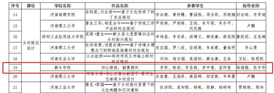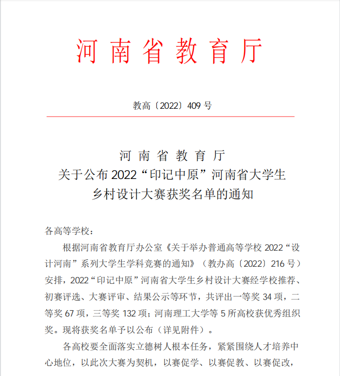 2022年12月21日河南省教育厅公布了2022年“印记中原”河南省大学生乡村设计大赛的结果,我院的参赛队伍在比赛中荣获三等奖1项。