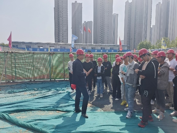 在项目施工区域,张永才老师和白翔宇老师为同学们讲解了地质条件及基础的类型,起重机的起吊注意事项,以及现场有关构件的材料加工要求。随后老师带着同学们观看了项目文化宣传栏并进一步了解施工企业的建筑成就。最后老师就本次认知见习做出总结,并对以后的认知见习做出要求,并再次强调了进入项目现场的安全事项。