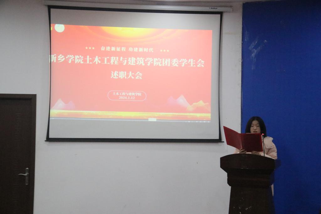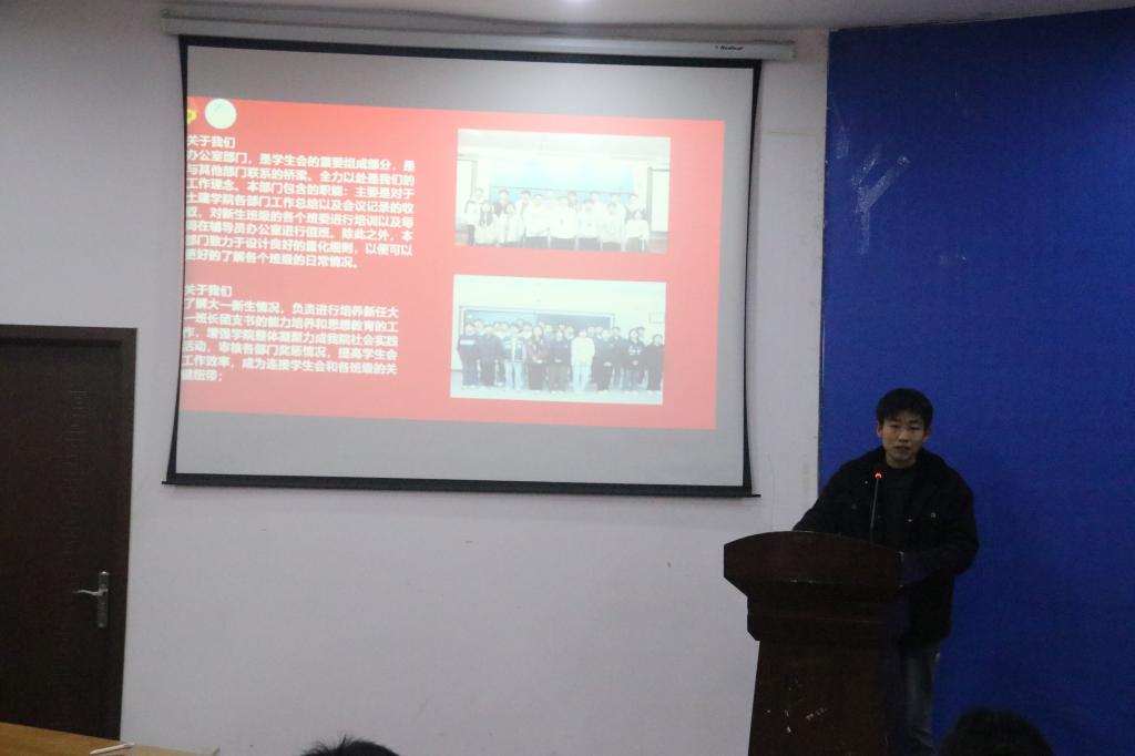 然后,团委学生会各工作部负责人依次进行述职。各工作部负责人分别就部门建设、活动总结、问题反思、未来规划四个方面进行阐述。媒体宣传部负责人用诙谐幽默的语言和精彩的PPT展示了工作部内部之间从陌生到熟悉的过程,表现了成员之间愈加默契的配合和愈加深厚的感情;权益创新部负责人列举出过去一学期中工作部工作的具体事件和成绩,重点赞扬了部员们丰富的想象力和极具创意的头脑;文体活动部负责人不仅条理清晰地展示本学期丰富的工作成果,也分析了工作中存在的不足之处,并提出改进措施以及发展建议,表示将会以更高的要求严格对待自己。汇报结束后,袁大伟老师致闭幕词。袁大伟老师希望同学们能够树立远大理想,在未来的学年中明确目标,务实创新。