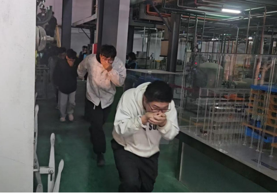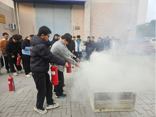 随后吕南和保卫处老师指导了学生应急疏散演练。吕南向参加演练的学生介绍了疏散路线和逃生注意事项,强调要做到听从指挥,有序疏散,确保安全。火灾警报响起后,学生们沉着冷静,捂住口鼻、低头弯腰,在疏散组成员的组织下有序地进行紧急疏散,迅速撤离。实验室管理员立即切断电源,模拟火灾初期的灭火工作,防止火势扩大蔓延。学生们撤离到安全地点、人数清点无误后,吕南向学生讲解了灭火器的灭火原理、使用方法及注意事项,并指导学生现场灭火。