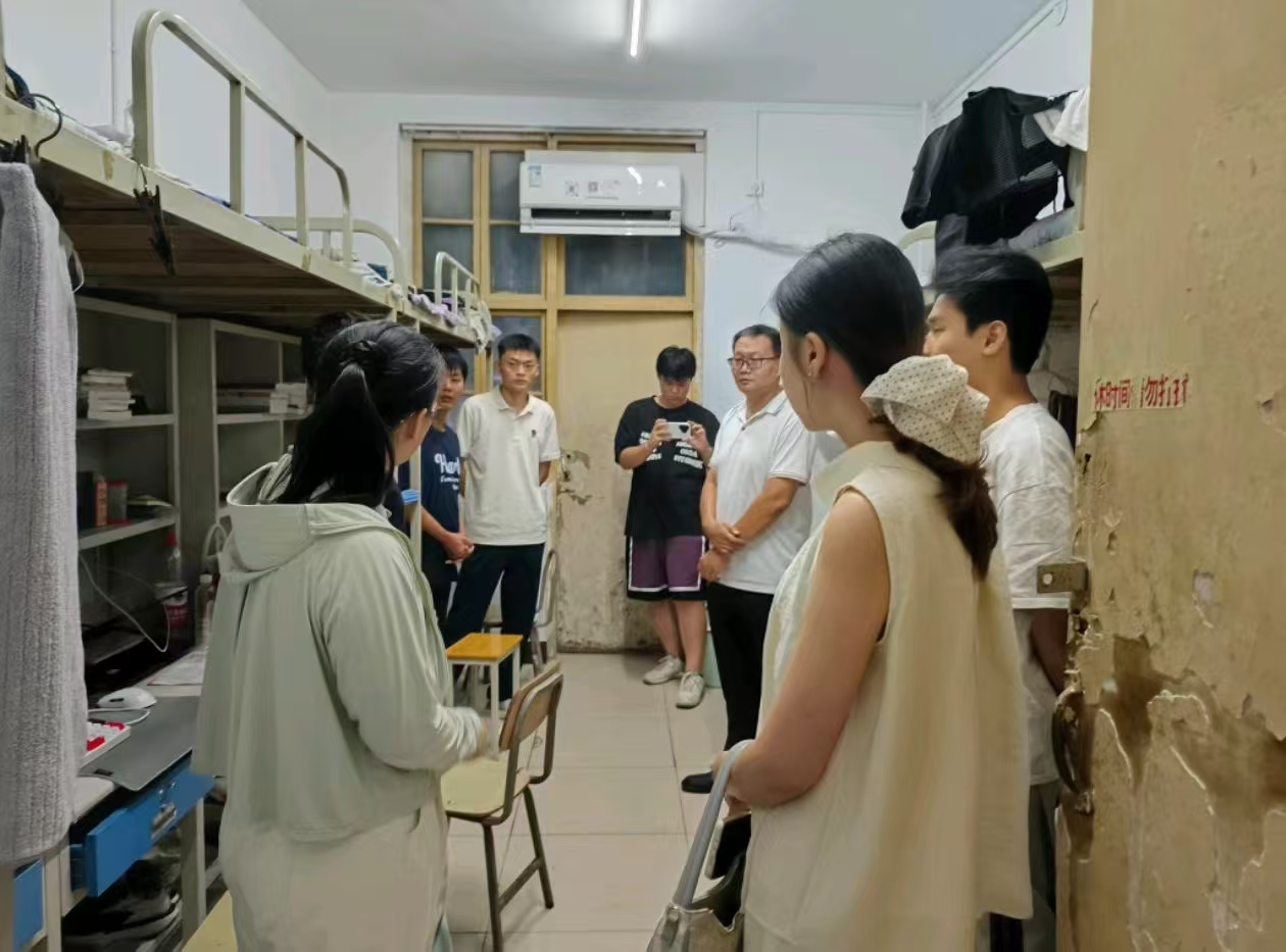 袁大伟与许玲玲、杨晓玥老师一同走进学生宿舍;首先,对宿舍的基本卫生进行了解与排查,旨在维护宿舍卫生,为同学们营造良好的居住环境。随后,老师们对宿舍的床铺、水电、门窗等展开逐一检查,为同学们提供更加舒适、安全的住寝环境。最后,袁大伟、许玲玲和杨晓玥老师在走进新生宿舍、查看住宿环境的同时,主动与新生们围坐交流。一句句关切的询问,让新生们倍感温暖。交流中,袁大伟老师结合自身经历,向新生分享校园生活小贴士,并鼓励大家既要认真钻研专业知识,也要积极参与社团活动,在探索中成长,在实践中提升,不负青春韶华。