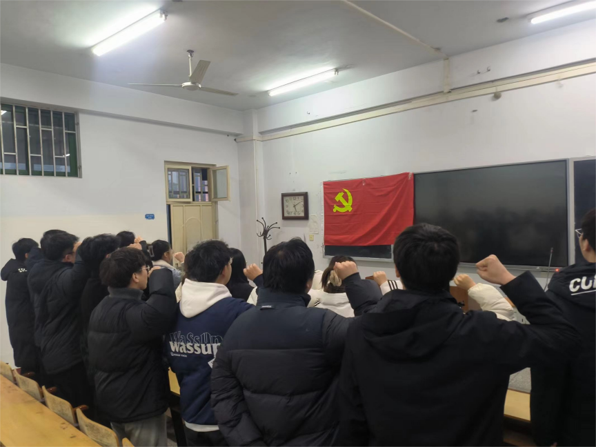 2025年1月3日,学生第一、第二党支部联合在A04-412举行了以“重温入党誓词,牢记党员使命”为主题的党日活动。全体党员在党旗前庄严宣誓,重温入党誓词,进一步强化了党员的党性修养,激励党员们不忘初心,牢记作为学生党员的责任与担当。