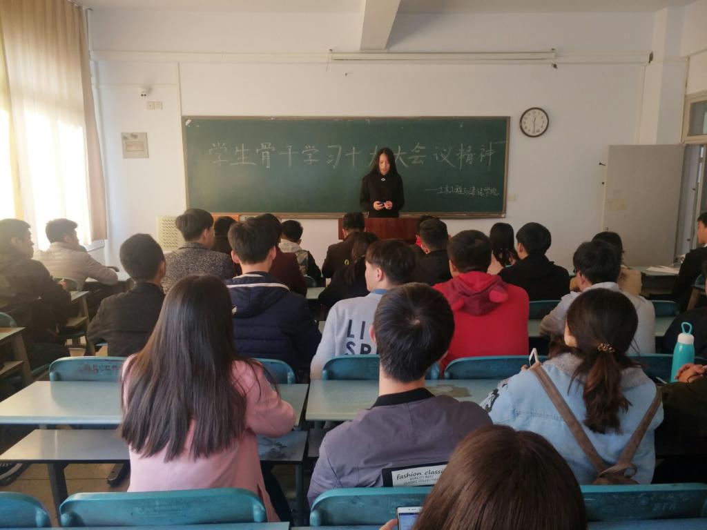 为深入贯彻落实党的十九大精神,11月14日中午12点30分于A06-503教室,我院召开了学生干部学习十九大会议精神的会议。学生会干部及各班班长和团支书参加了此次活动。